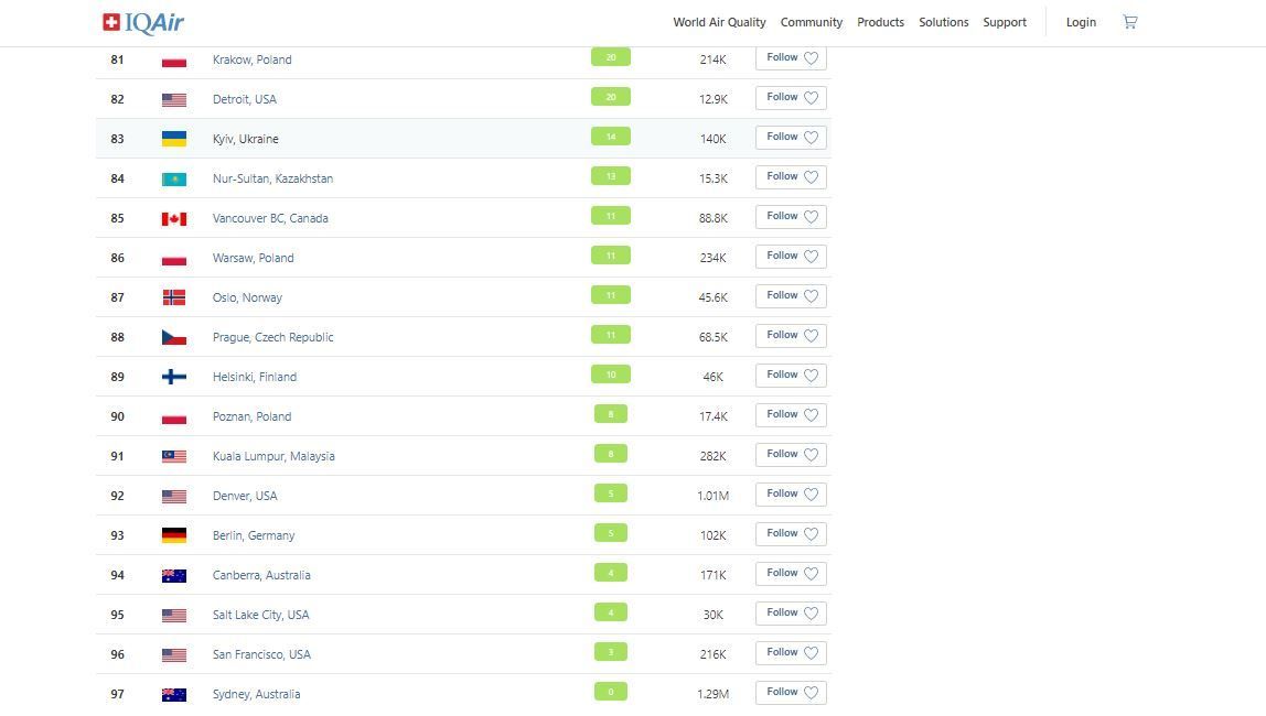 Відповідний рейтинг публікує портал IQAir.
