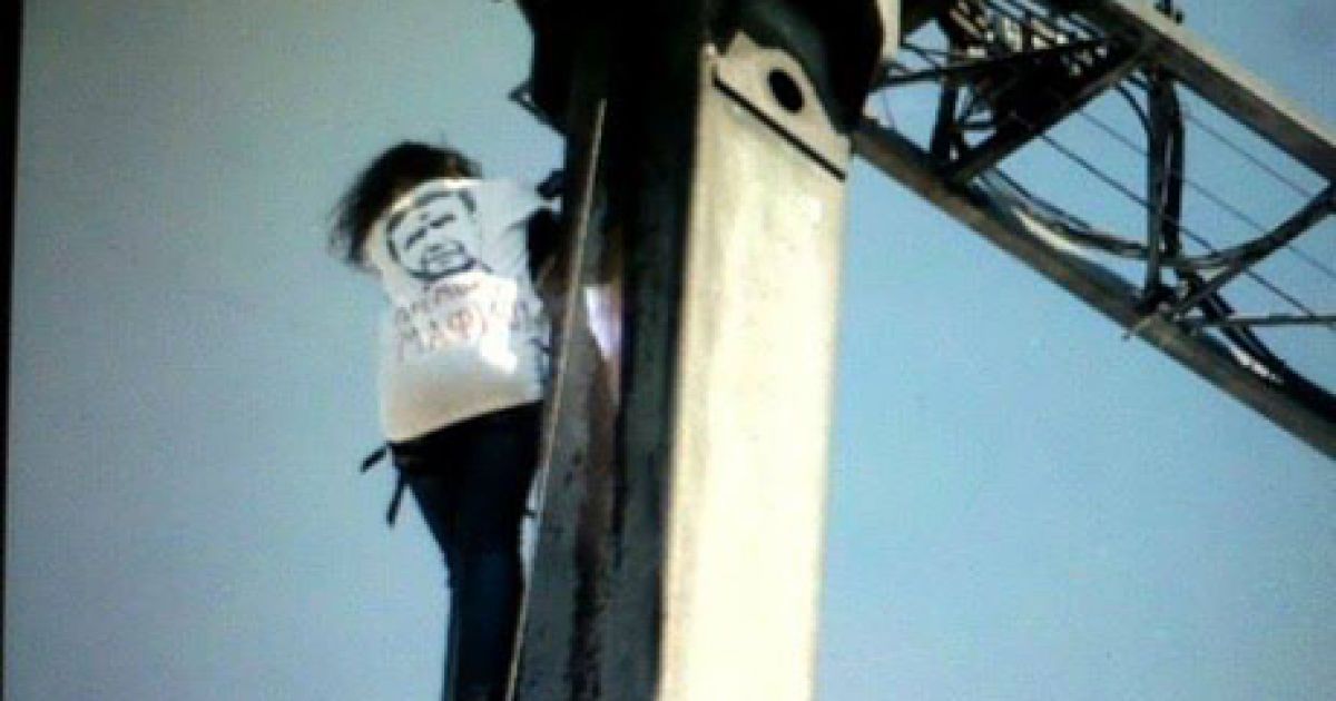 Троє активістів: Тетяна Чорновіл, Ігор Луценко і Марія Лєбєдєва, - вилізли на кран біля Гостинного двору, який працює на реконструкції пам'ятки.