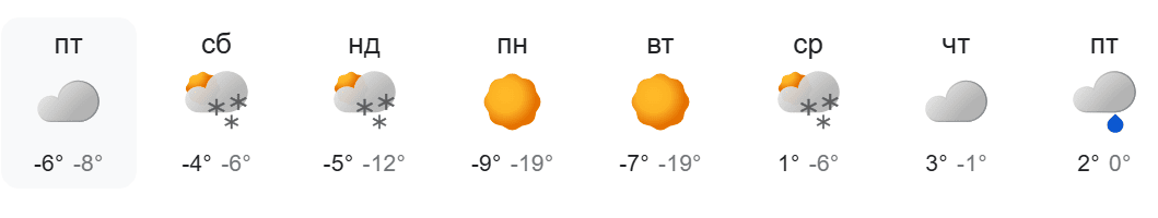 Зазначимо, що у Києві від неділі, 8 лютого, знову очікуються морози до -19°C. Лише від середи, 11 лютого, стовпчик термометра поповзе вверх і вдень синоптики прогнозують +1°C.