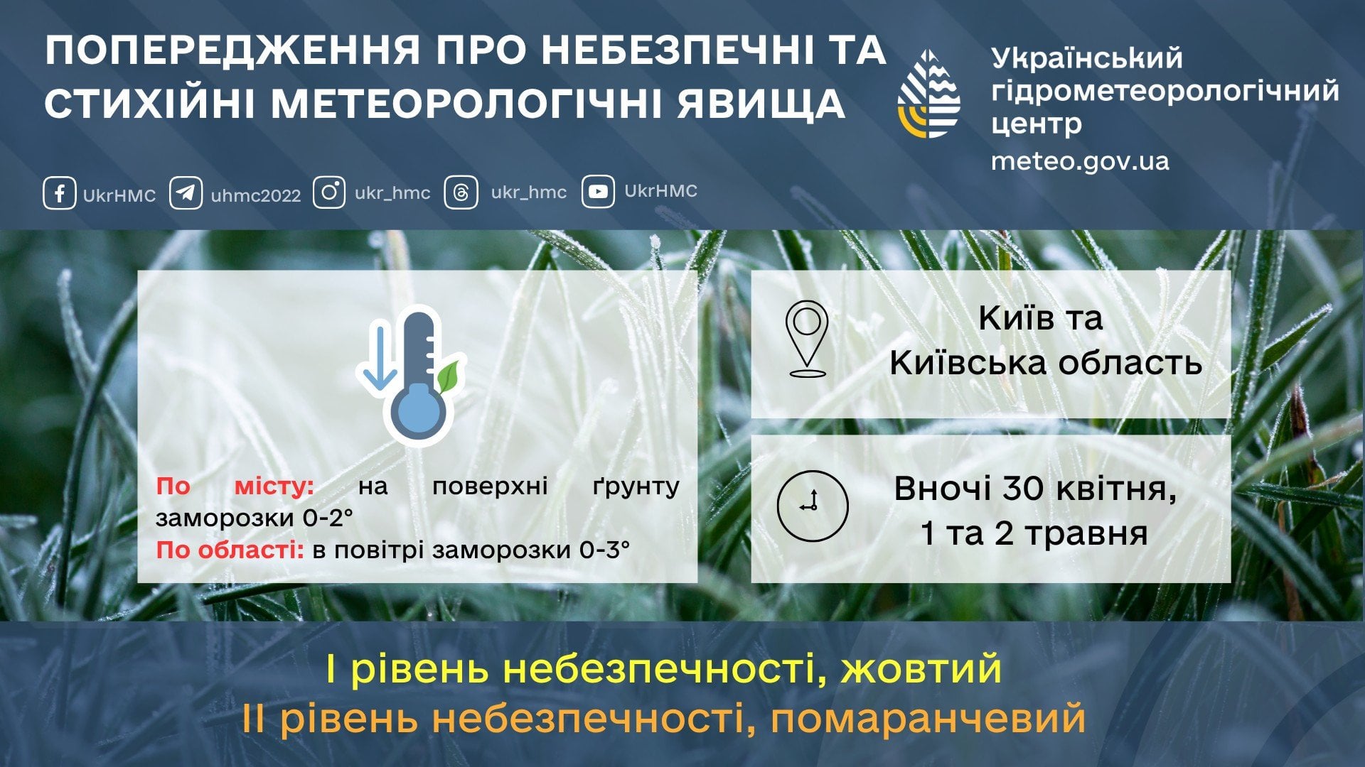 Київська область (II рівень небезпечності — помаранчевий): вночі 30 квітня, 1 та 2 травня очікуються заморозки у повітрі від 0° до 3°. Температура вдень становитиме 8-13° тепла.
