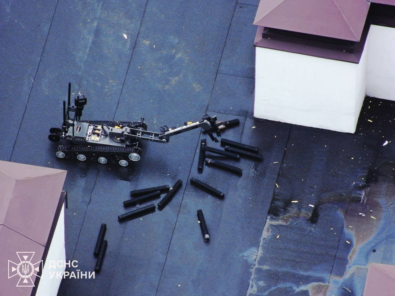 До операції залучили роботизовані системи, безпілотники та багатофункціонального саперного робота. Оператори ДСНС працювали в тандемі: дрони забезпечували огляд і контроль ситуації, а робот на даху акуратно зібрав усі вибухонебезпечні предмети у спеціальну місткість. Після цього її підняли краном та завантажили до піротехнічного автомобіля.