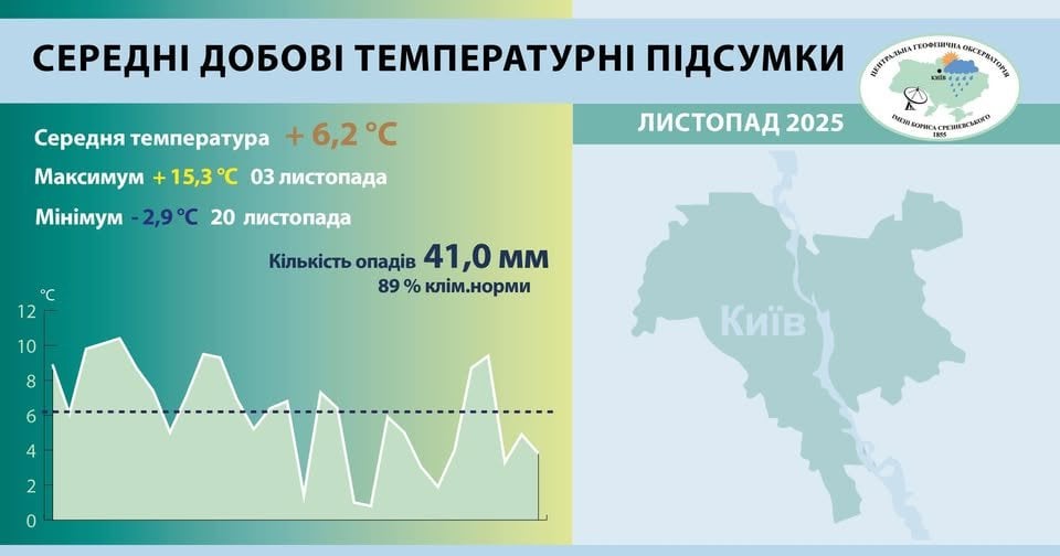 Середньомісячна температура повітря листопада у столиці становила 6,2°С, що вище кліматичної норми на 3,6°C.