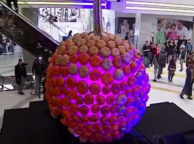 Підсвічена пурпурним світлом сфера заввишки з людину була вкрита маленькими гарбузиками. Рекордний гарбуз розмістили в холі ТРЦ, де навколо нього танцювали моторошні зомбі.