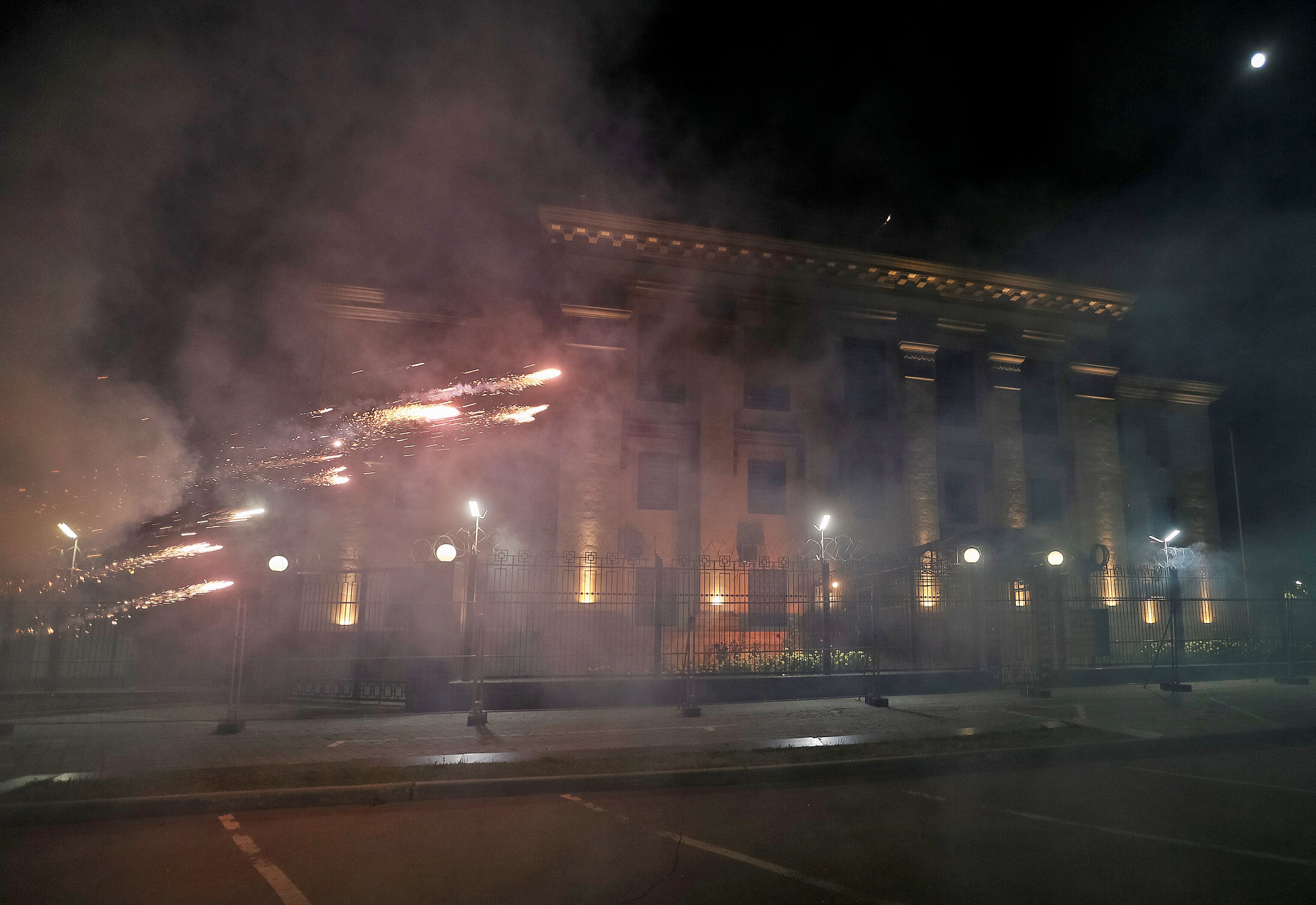 Близько 20 осіб закидали будівлю петардами та салютами, після чого розбіглися, повідомляє Страна.