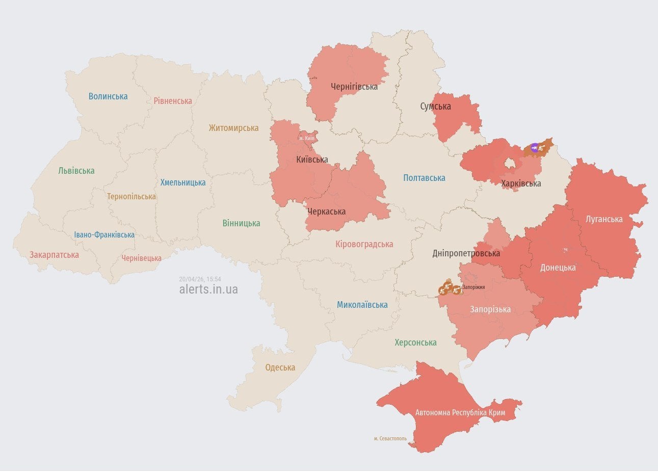 У Києві пообіді 20 квітня оголосили повітряну тривогу через загрозу від ворожих безпілотників. Сирени також лунають у низці інших регіонів.