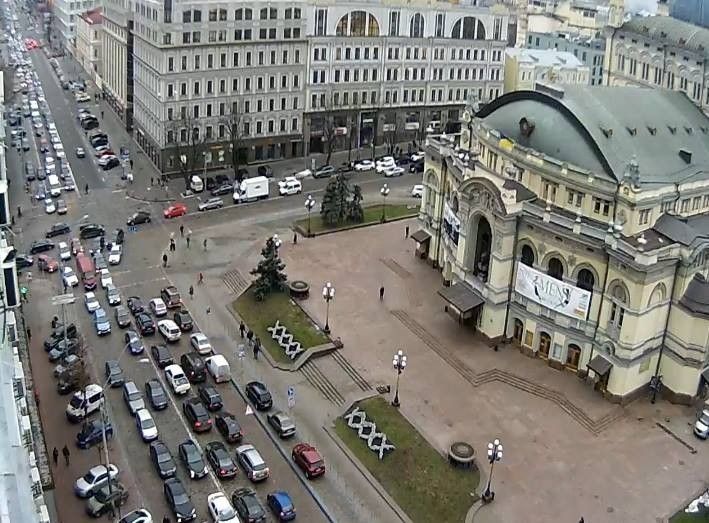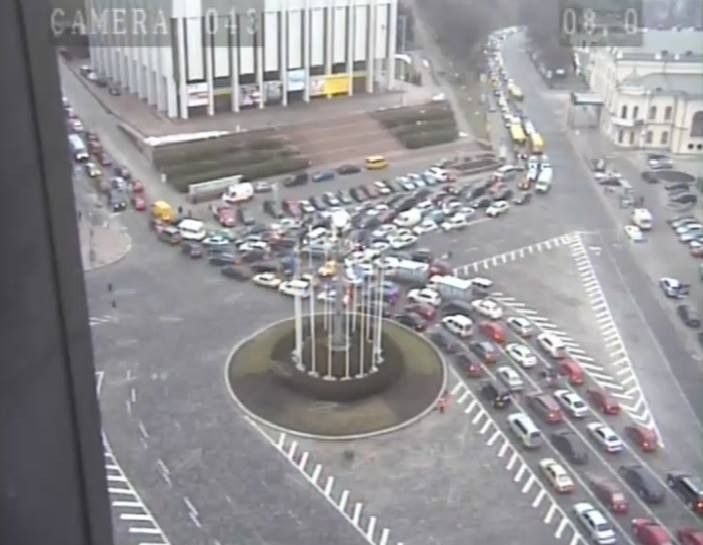 Столичный центр стоит в пробках из-за анонсированного перекрытия Майдана Независимости, Крещатика и прилегающих улиц, где сегодня проходят торжества ко Дню Революции достоинства.