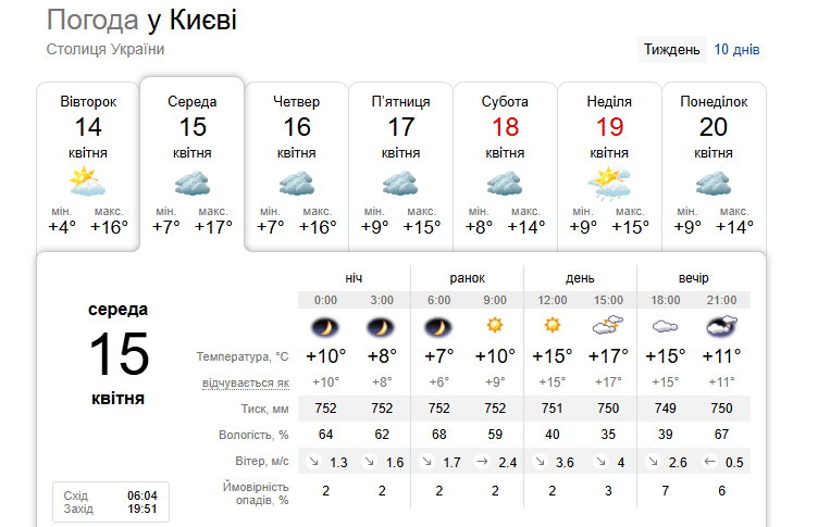 В среду, 15 апреля, жителей столицы и Киевской области ожидает облачная, но сухая погода с дневным теплом до +18 градусов выше нуля, которое ночью сменится коварными заморозками на почве.
