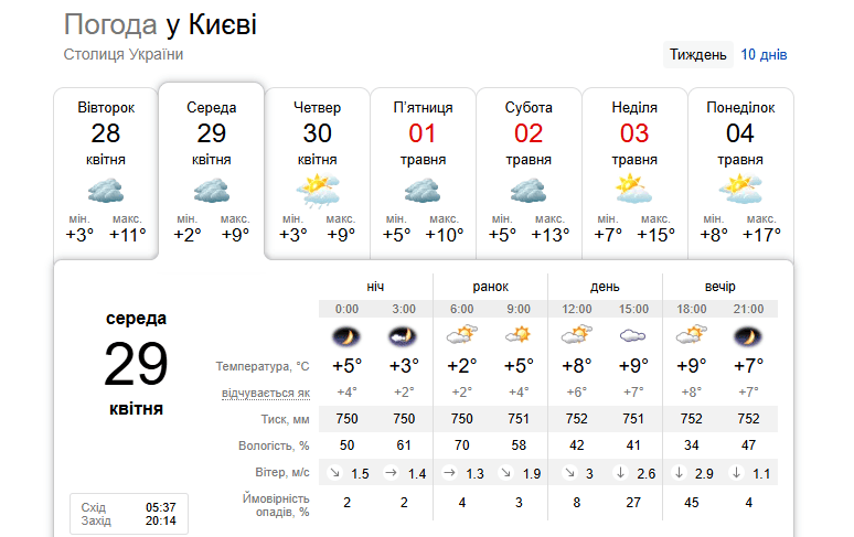 На погодном портале Sinoptik отмечают, что в столице в течение всего дня 29 апреля небо будет покрыто облаками. Без осадков. Температура воздуха будет колебаться от +3 градусов тепла ночью до +9 градусов тепла днем.