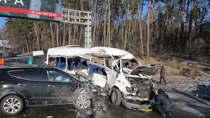 В Киевской области на Гостомельском шоссе около 9:00 в воскресенье, 11 января, произошло столкновение маршрутки Mercedes-Benz Sprinter и внедорожника Hyundai Santa Fe.