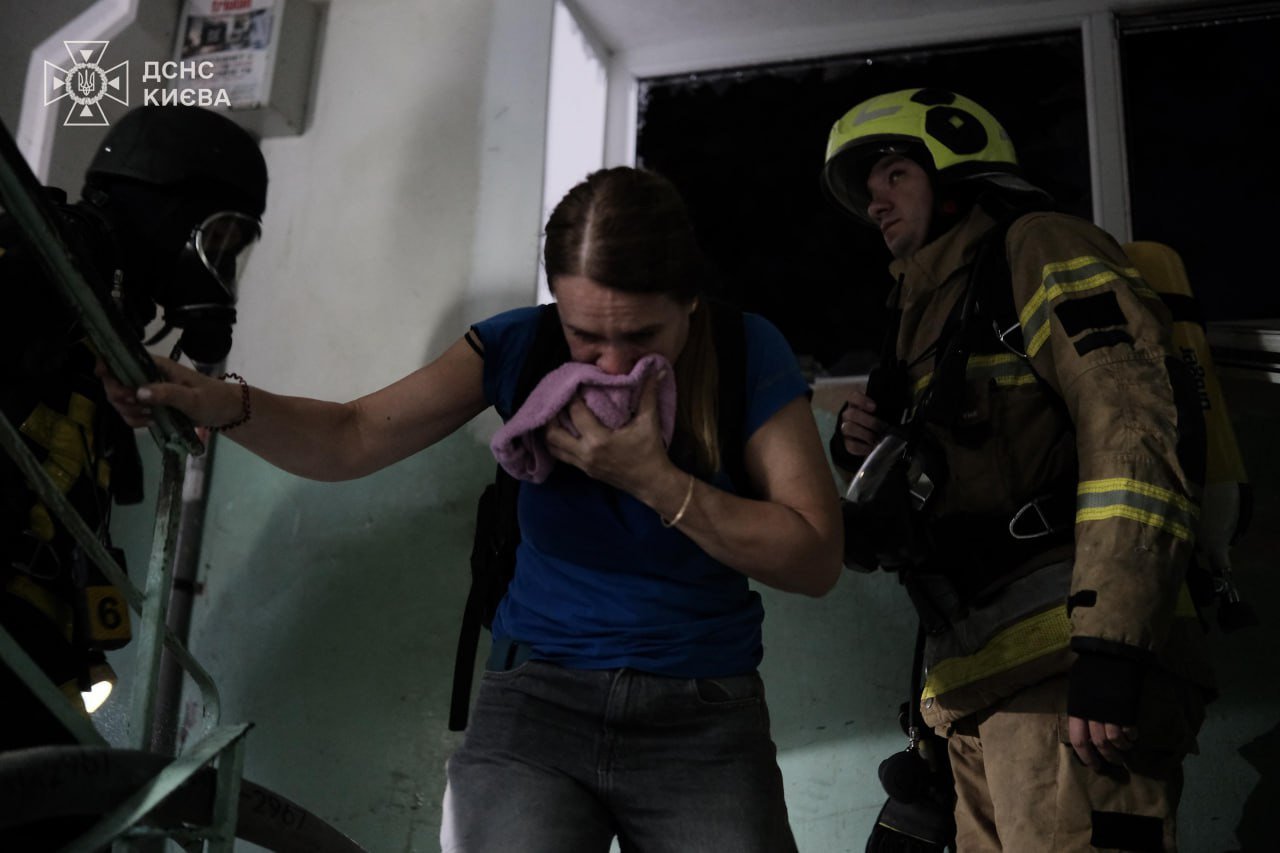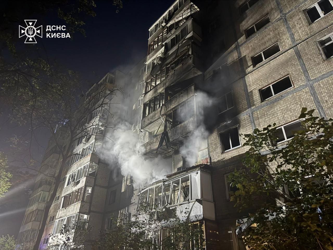 В Дарницком районе зафиксировали попадание в четырехэтажный жилой дом — там возник пожар на двух этажах и частичное разрушение.
