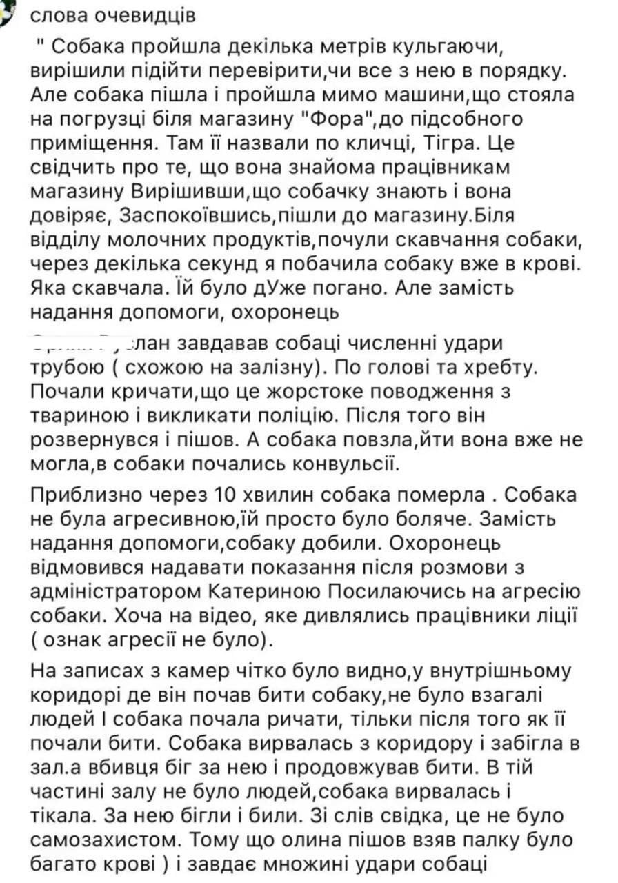 Как мы писали, в Гостомеле охранник супермаркета «Фора» металлической палкой забил до смерти собаку, попавшую в торговый зал. Полиция открыла уголовное производство по жестокому обращению с животными. В магазине утверждали, что животное вело себя агрессивно. Впрочем, очевидцы и зоозащитники называют действия охранника жестокими. Инцидент вызвал возмущение среди местных жителей и активистов, призывающих к прозрачному расследованию.