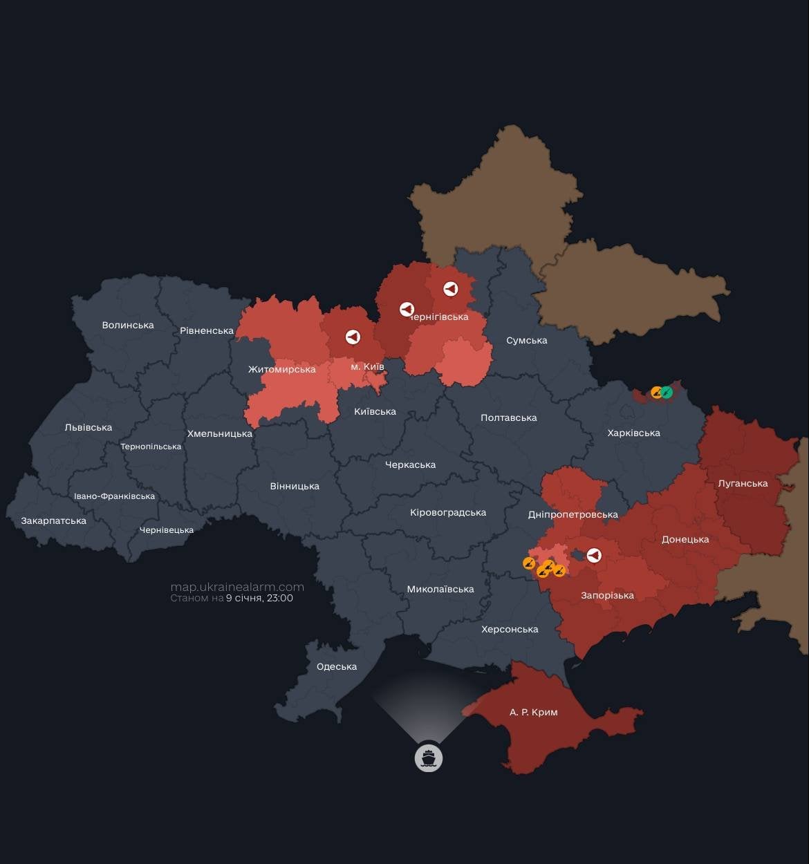 В Киеве и ряде областей Украины 9 января раздается воздушная тревога из-за угрозы враждебных БПлА.