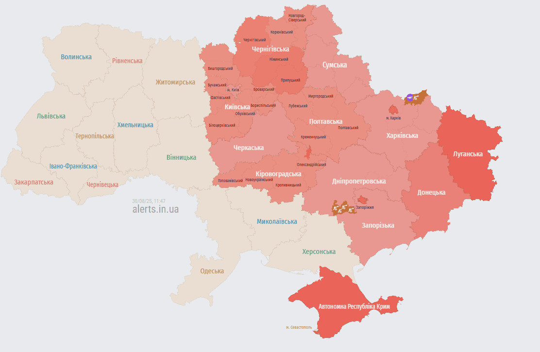 В субботу, 30 августа, в Киеве снова объявили воздушную тревогу. Сирены раздались в 11:42. Это уже третья тревога с утра.