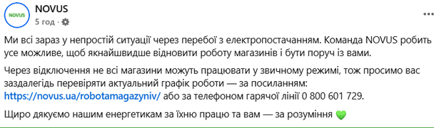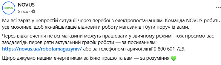 «Мы все сейчас в непростой ситуации из-за перебоев с электроснабжением. Команда NOVUS делает все возможное, чтобы как можно быстрее возобновить работу магазинов и находиться рядом с вами. Из-за отключения не все магазины могут работать в обычном режиме и просим вас заранее проверять актуальный график работы», — сообщила сеть супермаркетов NOVUS.