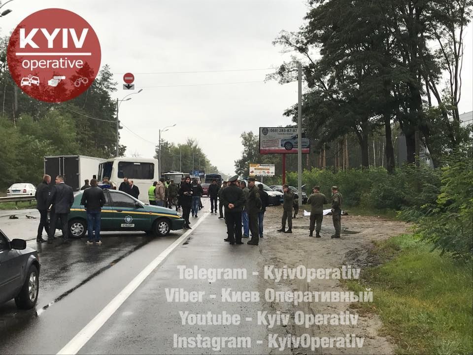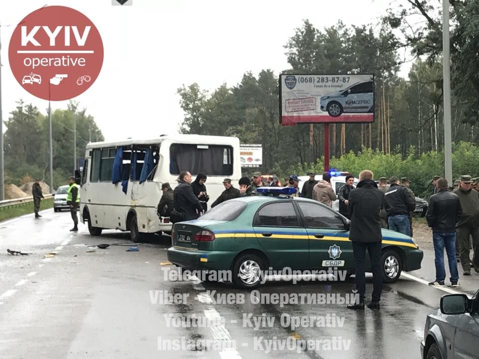 Ранее сообщалось, что смертельная авария произошла около 7 утра: один человек погиб, еще 8 получили травмы. Пассажирский автобус сообщением "Дымер - Киев" столкнулся со служебным автобусом Национальной гвардии Украины, который двигался в колонне. В результате ДТП погиб военнослужащий, еще 7 военных и один пассажир общественного транспорта с различными телесными повреждениями доставлены в больницу.