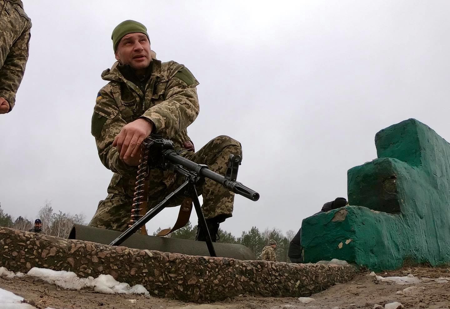 Кличко также выложил фото с учений, где он — в военной форме и каске, бросает гранату, ложится под танк.
