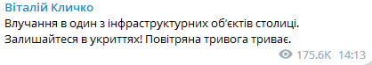 "Попадание в один из инфраструктурных объектов столицы. Оставайтесь в укрытиях! Воздушная тревога продолжается", — написал Кличко.