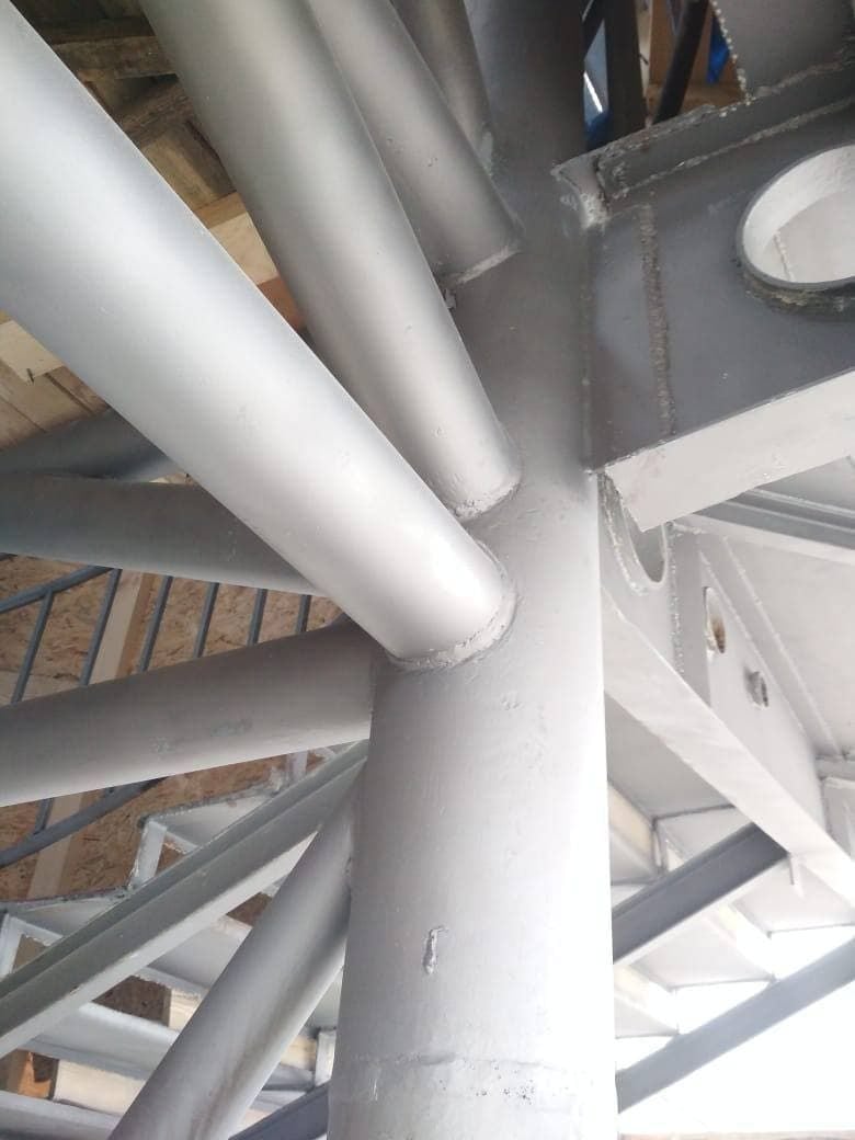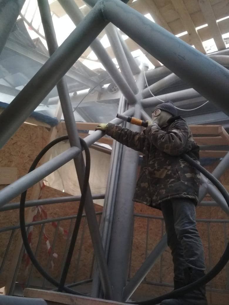 Сейчас работники начали очищать металлические элементы песчано-струйным методом.
