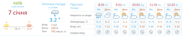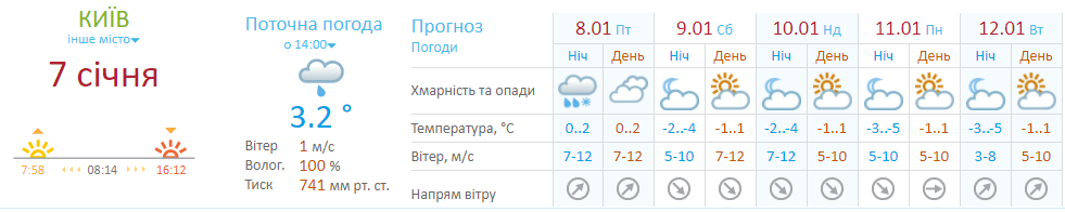 Как сообщает Укргидрометцентр, 8 января в Киеве ожидается от 0 до 2 градусов выше нуля. Ветер юго-западный, 7-12 м/c. Ночью будет идти дождь со снегом, днем — без осадков.