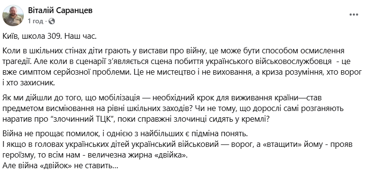 "Это не искусство и не воспитание, а кризис понимания, кто враг и кто защитник. Как мы дошли до того, что мобилизация – необходимый шаг для выживания страны – стал предметом высмеивания на уровне школьных мероприятий? Не потому ли, что взрослые сами разгоняют нарратив о "преступном ТЦК", пока настоящие преступники сидят в Кремле?", - подчеркнул Саранцев.