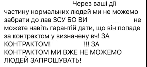 Військовослужбовиця розповіла, що на передовій вони з побратимами дуже чекали спеціаліста з РЕБ. Але так і не дочекалися. Чоловік прийшов до Солом'янського ТЦК підписати контракт, але там співробітниця йому сказала, що його не можуть розподілити до зазначеної військової частини, оскільки він не пройшов у них ВЛК.