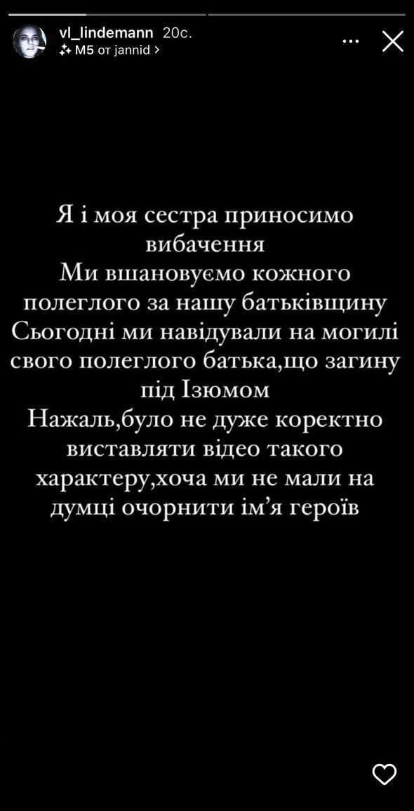 "Я і моя сестра приносимо вибачення. Ми вшановуємо кожного полеглого за нашу батьківщину. Сьогодні ми навідувалися на могилу свого полеглого батька, що загинув під Ізюмом. На жаль, було не дуже коректно виставляти відео такого характеру, хоча ми не мали на думці очорнити ім’я героїв", – йдеться в повідомленні однієї з порушниць.